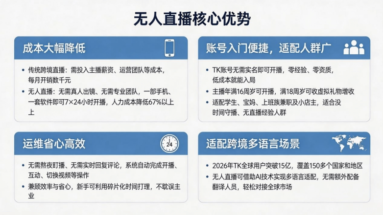 2026年全球跨境电商市场规模将冲破5万亿美元,相较保守实人曲播劣势显著。零经验也能成功入局,无人曲播成为新手入局跨境的高效径。针对新手痛点,一对一专人指点、赛道规划、风控规避,笼盖双赛道,实现一键、从动变现、平安值守。